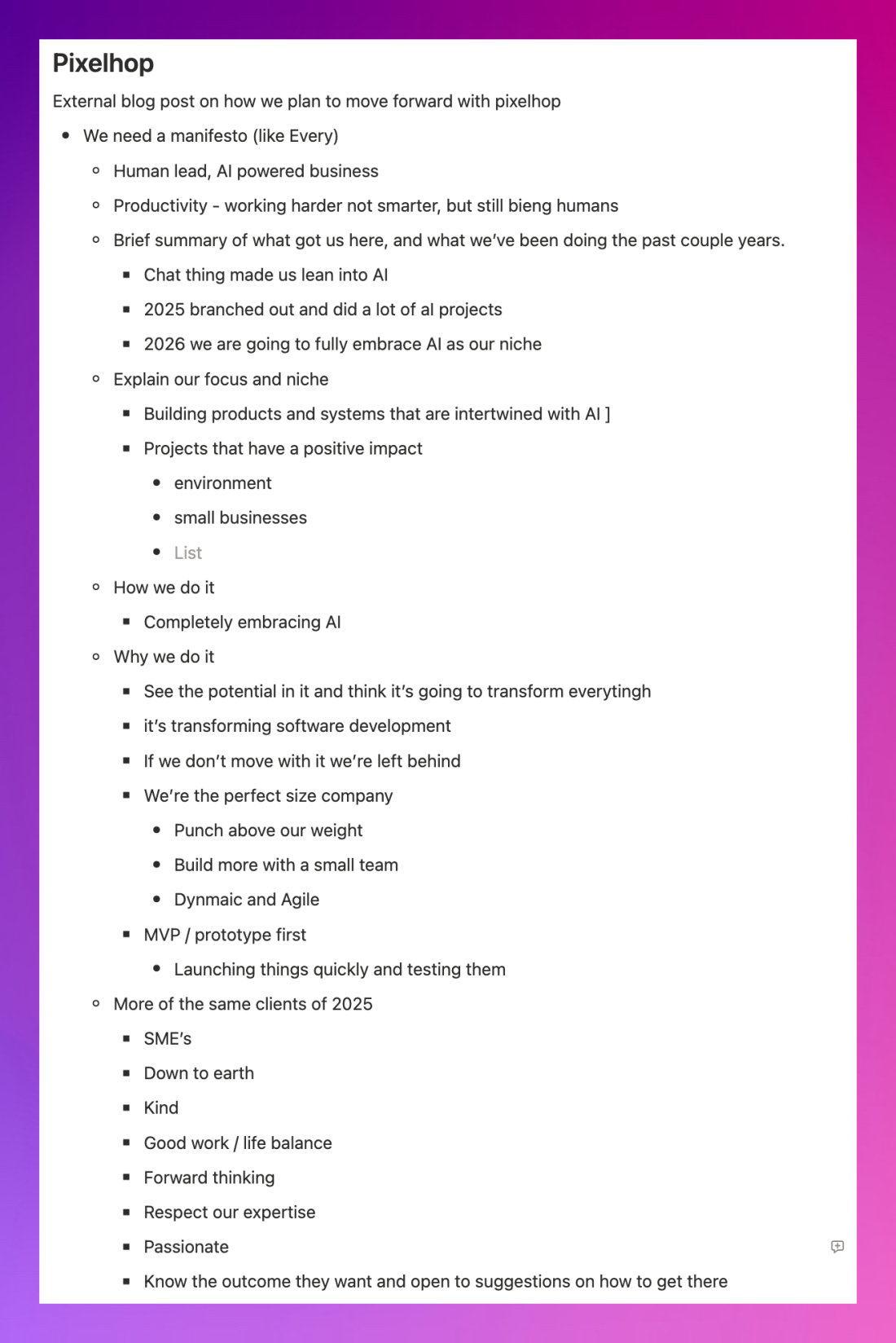 We then wrote up our manifesto and north star. So we did all the real thinking. But turning 20 pages of notes into a presentation? That's where I usually lose time.
