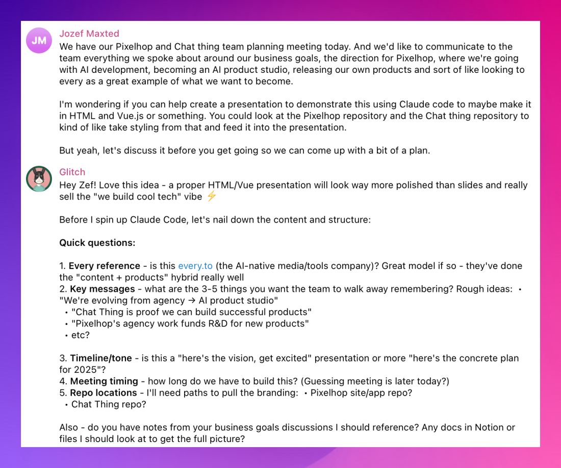 We just asked Glitch to turn our ideas into a beautiful HTML presentation. And it delivered: Pixelhop branding, keyboard navigation, proper structure. The works.