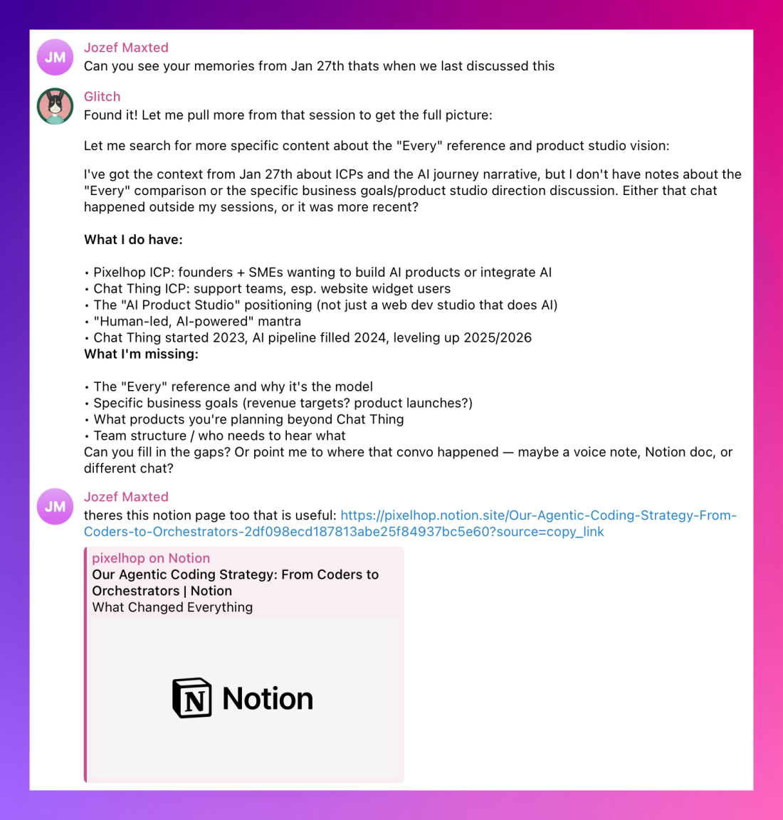 Glitch is our AI assistant. It runs on OpenClaw, an open-source framework that connects Claude (the AI model) to real tools: file access, web browsing, code execution, and more. Think of it as giving an AI hands, not just a voice.